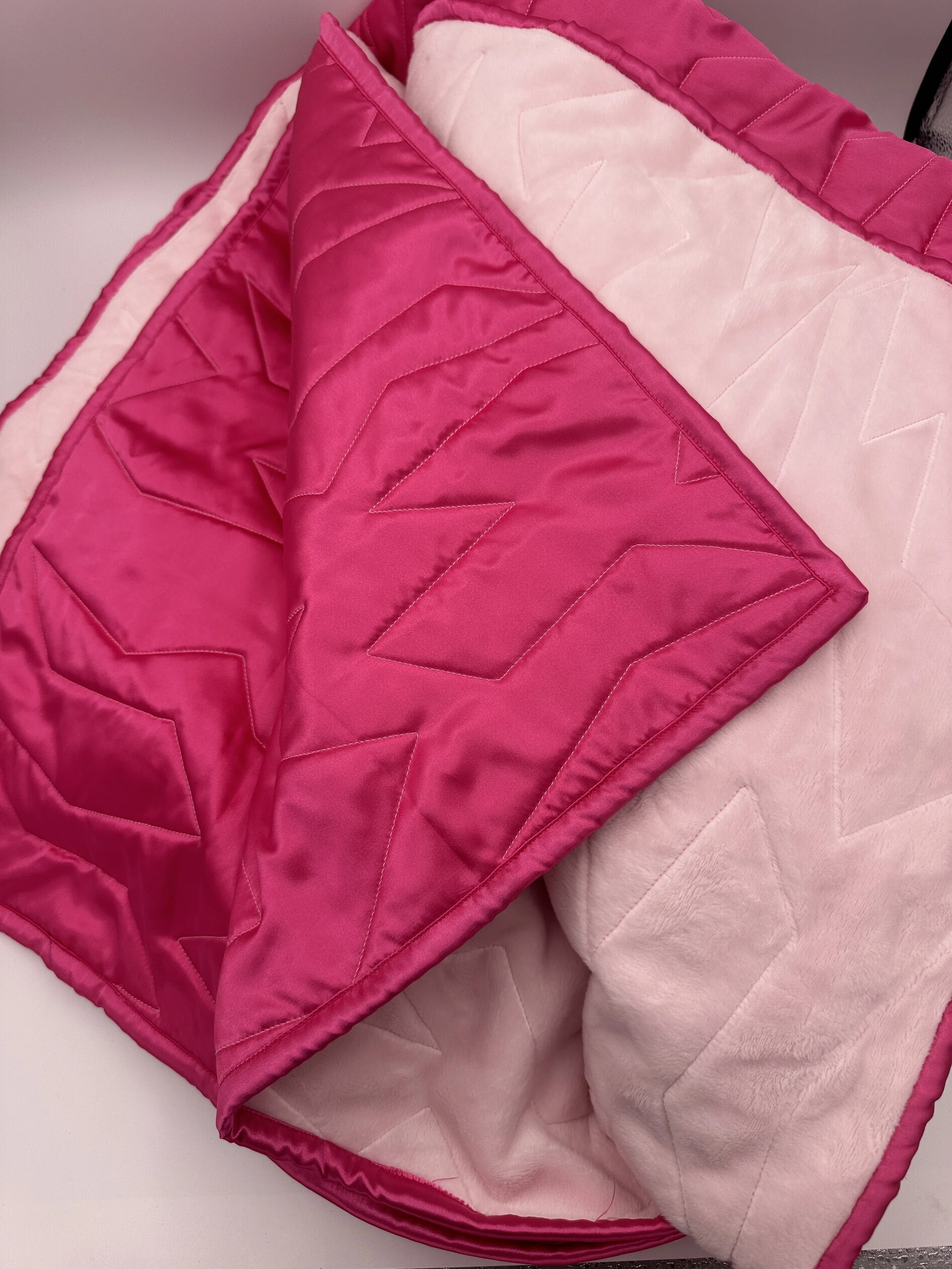 My client didn’t want a typical pieced quilt top so we just layered satin, batting, & cuddle (or minky) fabric. We picked an edge to edge design so when the blanket is washed the layers stay put. The result was a super soft silky blanket that will last for years.